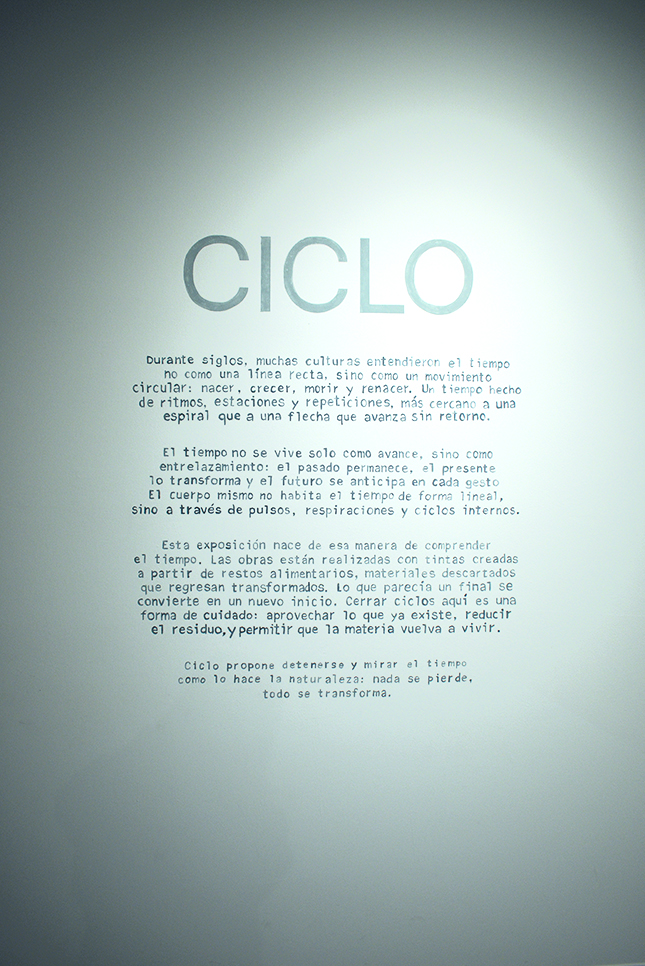 Esta exposición nace de esa manera de comprender el tiempo. Las obras están realizadas con tintas creadas a partir de restos alimentarios, materiales descartados que regresan transformados. Lo que parecía un final se convierte en un nuevo inicio. Cerrar ciclos aquí es una forma de cuidado: aprovechar lo que ya existe, reducir el residuo, permitir que la materia vuelva a vivir.