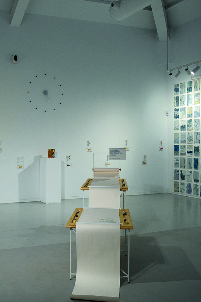 Esta instalación propone jugar con el tiempo, porque no siempre se siente igual. A veces vuela y otras veces se detiene. Como decía San Agustín, el tiempo es un misterio: siempre corre, pero nunca lo vemos pasar. Cada reloj de arena contiene uno de los doce pigmentos creados a partir de doce restos alimentarios. Algunos tiñen más y otros menos; pero cada uno exige su propio ritmo, su propio proceso y su propio tiempo para existir.